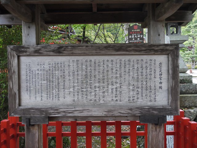 ![]() 出雲大神宮(いずもだいじんぐう)は、京都府亀岡市にある神社。式内社(名神大社)、 丹波国一宮。旧社格は国幣中社で、現在は神社本庁に属さない単立神社。 旧称は出雲神社。別称として「元出雲」・「千年宮」とも。また古くは「大八洲国国祖神社」と称されたともいう。 亀岡盆地東部に立つ御蔭山(御陰山、御影山、千年山とも)の山麓に鎮座し、御蔭山を神体山として祀る神社である。 「元出雲」の別称は、出雲大社が当社からの分霊とする社伝(後述)に由来する。 いわゆる出雲大社は明治時代に至るまで「杵築大社」を称していたため、 江戸時代末までは「出雲神社」と言えば当社を指していた。 社伝では逆に、出雲大社の方が当社より勧請を受けたとし、「元出雲」の通称がある。 (Wikipediaより) ※ |