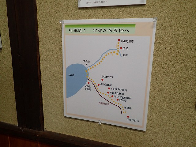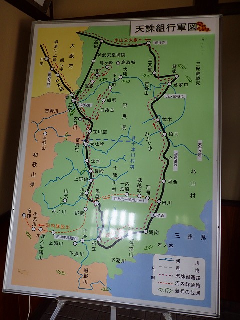 ![]() 代官屋敷の屋門を五條市民俗博物館が〜 その他の敷地は奈良家庭裁判所など法務局・検察庁が… ※文久3年8月13日、天皇の神武天皇陵参拝、攘夷親征の詔勅が発せられる(大和行幸)。 大和行幸を推進したのが、長州藩に気脈を通じる三条実美ら攘夷派公卿であった。 吉村虎太郎は松本奎堂、藤本鉄石、池内蔵太ら攘夷派浪士と共に、 大和行幸の先鋒となるべく大和国へ赴くことを決議。 14日、吉村らは中山邸を訪ねて忠光を方広寺へ誘い出した。 忠光を大将とする同志38人(内、土佐脱藩18人、久留米脱藩8人)は方広寺を出発して大和国へ向かった。 一行は長州下関へ下る勅使と偽って大坂から海路で堺へ向かう。 船中で忠光ら同志一行は断髪して決意を示した。 彼らの挙兵に際して淡路の大地主で勤皇家であった古東領左衛門は財産を全て処分し、軍資金として供出した。 (Wikipediaより) |