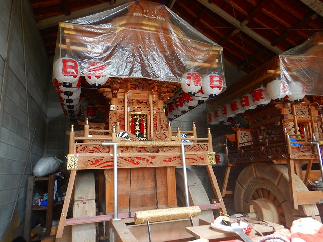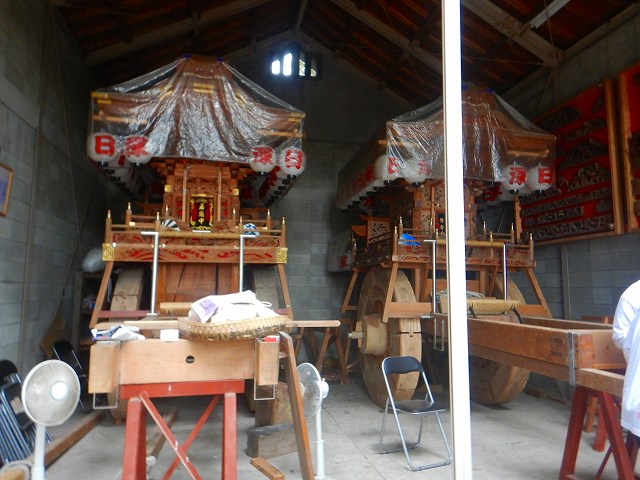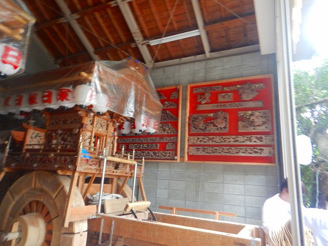 ![]() 反対側の壁には 先代のやぐらの彫刻飾りが~ ※細かい彫と 人力車のような二輪やぐらは 私達は初めて見ました。 |