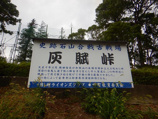 ![]() 灰賦峠(標高約18m) 石山合戦(いしやまかっせん)は、元亀元年9月12日(1570年10月11日)から 天正8年8月2日(1580年9月10日)にかけて行われた、 浄土真宗本願寺勢力と織田信長との戦い。 本願寺法主の顕如が石山本願寺に篭って戦った。 (Wikipediaより) 講和後、顕如が紀伊国鷺森別院(さぎのもりべついん:和歌山県和歌山市)に 移ってから2年後、織田信長は突如、紀伊国へ軍勢を派遣しました。 織田軍の総大将は、織田信長の三男「織田信孝」(おだのぶたか)が務めました。 手勢は約3,000人。対する了性は、金乗寺の僧兵はもちろん 近隣の村人にも声をかけて約1,800人をかき集めて、 織田軍の進路である灰賦峠へ向かいました。 兵力に劣る上、戦闘に不慣れな村人らが多数含まれていた了性軍は、 まともにぶつかっても勝ち目はありません。そこで了性が考案したのは、 村人達に竃の灰を持ち寄らせ、その灰をまき散らして目潰しをするという作戦でした。 1582年(天正10年)、灰賦峠の風上に陣取った了性軍は、眼下に織田軍を見つけると、 いっせいに崖の上から灰を撒き、さらに石つぶてで織田軍を攻撃しました。 完全なゲリラ戦法です。織田軍は、敵の姿も掴めず目潰しにあい、たちまち退却。 初戦は辛うじて了性軍が勝利しました。 しかし翌日、織田軍の兵士は灰を避けるために布を被るという対策を施して再び進軍。 戦うための武器も乏しかった了性軍は劣勢を強いられ、もはや敗戦は時間の問題でした。 そのとき、織田軍が突如として退却を開始。 実はこのとき、「本能寺の変」で織田信長が討たれたという情報が織田信孝のもとに届けられていたのです。 間一髪のところで峠を死守した了性軍。 この意外な結果に、村人や僧兵達は「仏のご加護によるもの」と信じ込んだと言われています。 九死に一生を得た顕如は、そのあと「豊臣秀吉」とも早急に和睦を結び、 以降、軍事行動を起こすことはありませんでした。 (刀剣ワールドHPより) ※緩やかに上っているんですわ。 |