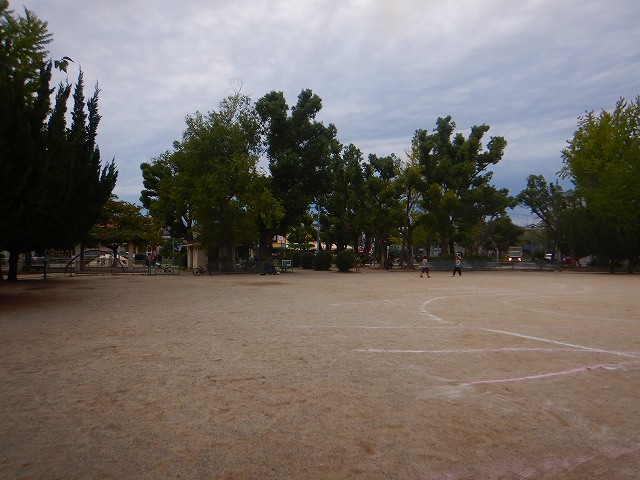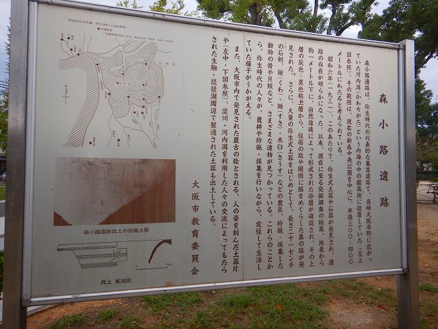 ![]() 白線は運動会の名残? ※森小路遺跡碑 昭和6年この付近で発見された、弥生時代の集落遺跡である。 セタシジミを主とした貝類のほか、櫛描文の土器なとが出土した。 最近の調査では、奈良時代から中世にかけてのものも発見される複合遺跡であることが判明した。 ここは標高3m以下のところで、市内における最低平地遺跡として注目されている。 (大阪市HPより) |